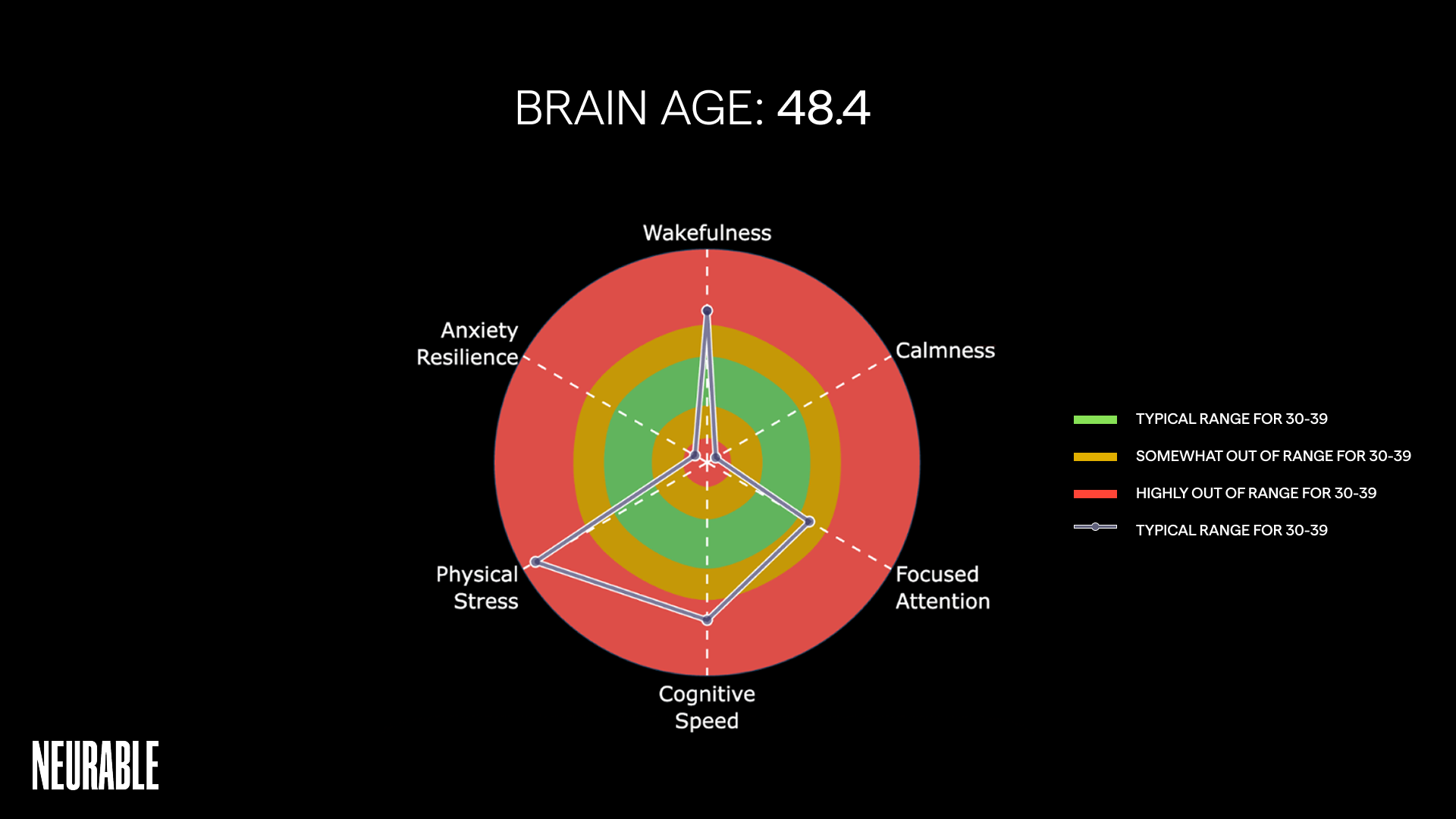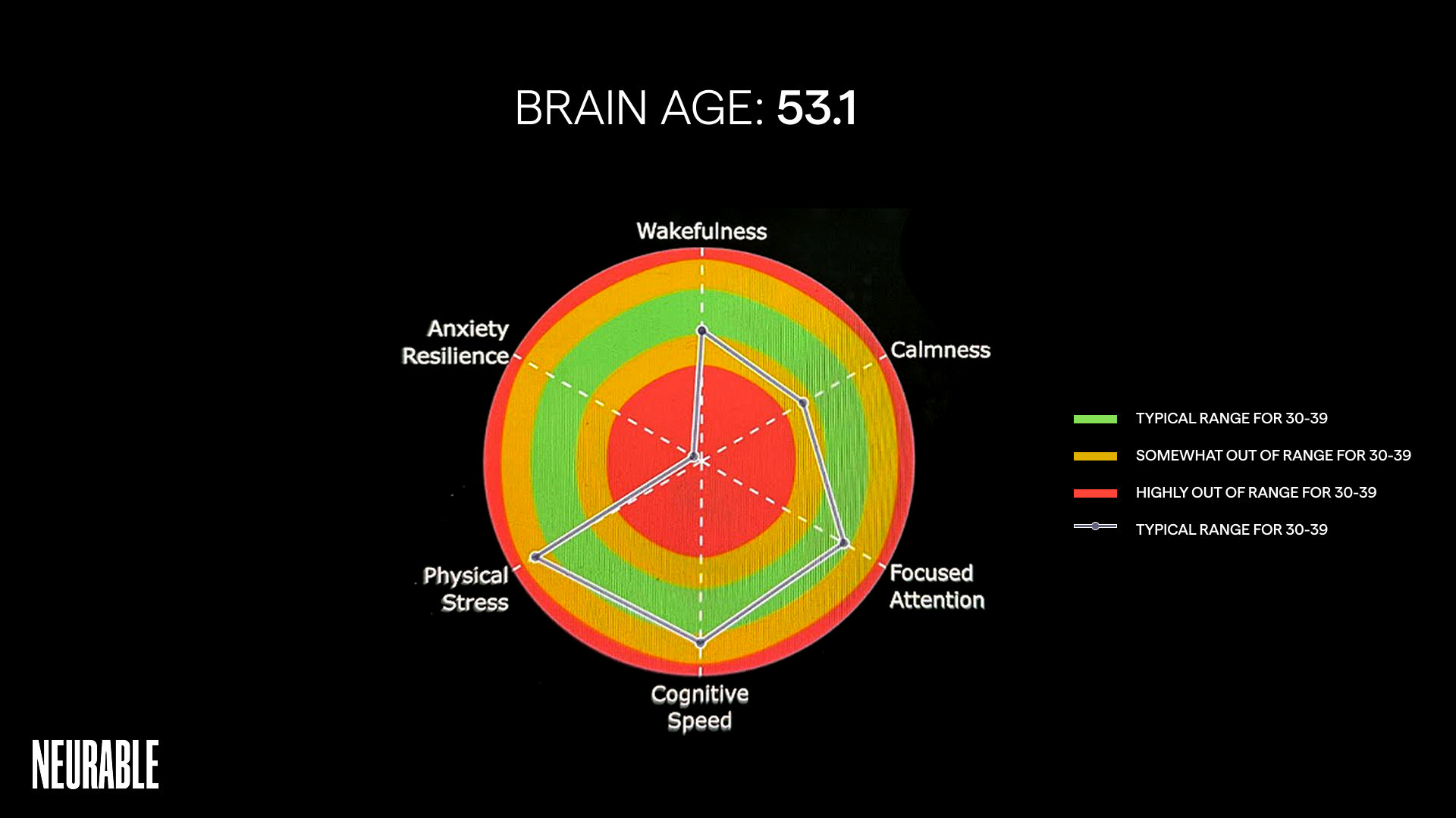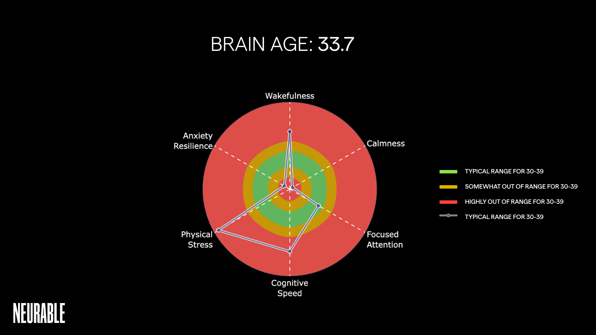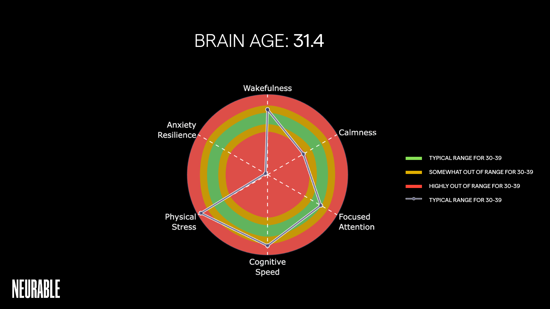 What happened over the next week is not a story most concussion patients get to tell — because most concussion patients don’t have access to what I had access to. I am a VP of Marketing at Neurable, a neurotechnology company that embeds EEG sensors into consumer headphones to measure brain health in real time. Our platform generates something called a Brain Age score — a composite metric derived from a number of neurological signals. The platform also shares six cognitive dimensions: wakefulness, calmness, focused attention, cognitive speed, physical stress, and anxiety resilience. My baseline brain age, on a typical day, hovers around 31. I’m 41 chronologically. I’ve always found that gap quietly satisfying.